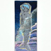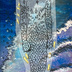 夜の海と魚のイメージのイラスト原画カードです。海の絵の上にトレーシングペーパーに描いたイラストを刺繍糸で貼り付けています。クレパス、ボールペン等を使用しているため色移りや水濡れにお気をつけください。サイズ:6×14.5(cm)